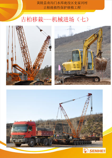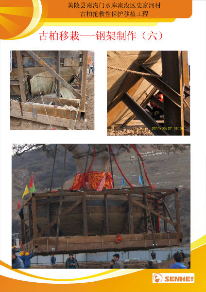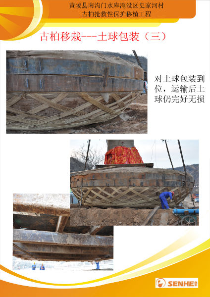 圖為我公司曾進(jìn)行的黃陵縣南溝門水庫(kù)淹沒區(qū)史家河村古柏?fù)尵刃员Wo(hù)移栽工程