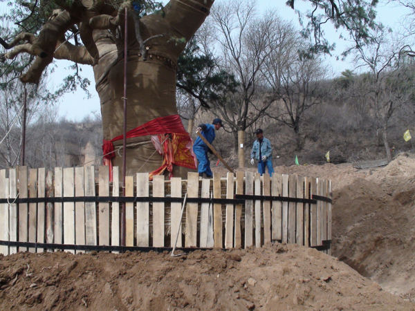 移植前布設(shè)復(fù)壯孔,強壯樹勢。(2009年)